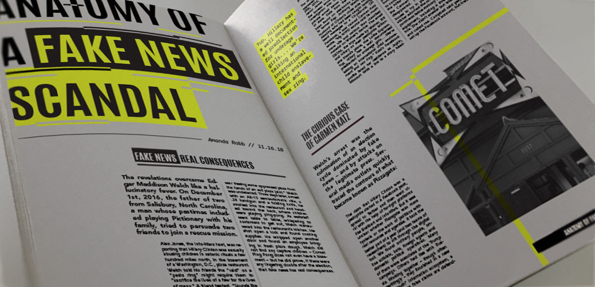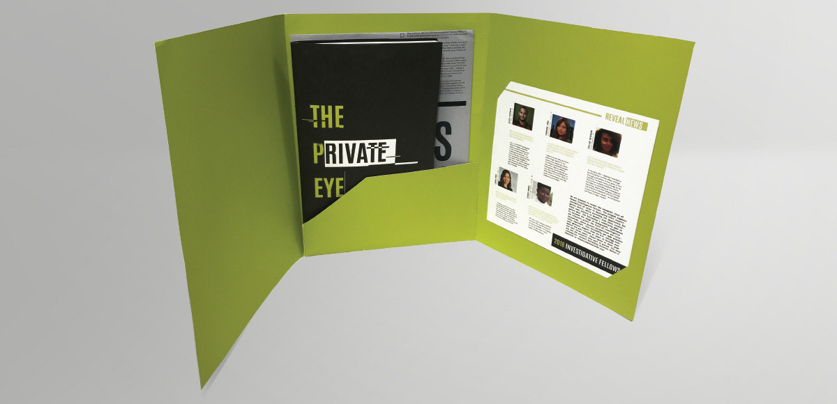 This project was comprised of many moving parts. An electric green folder housed the Printed Annual Report, a card component introducing the reader to board members of Reveal News, "Guide" to spotting Fake News, and a mobile website.